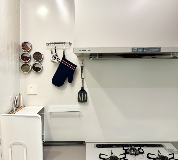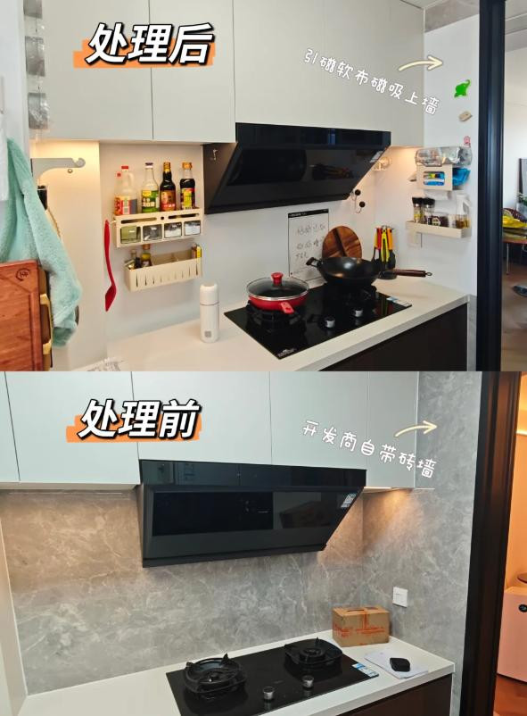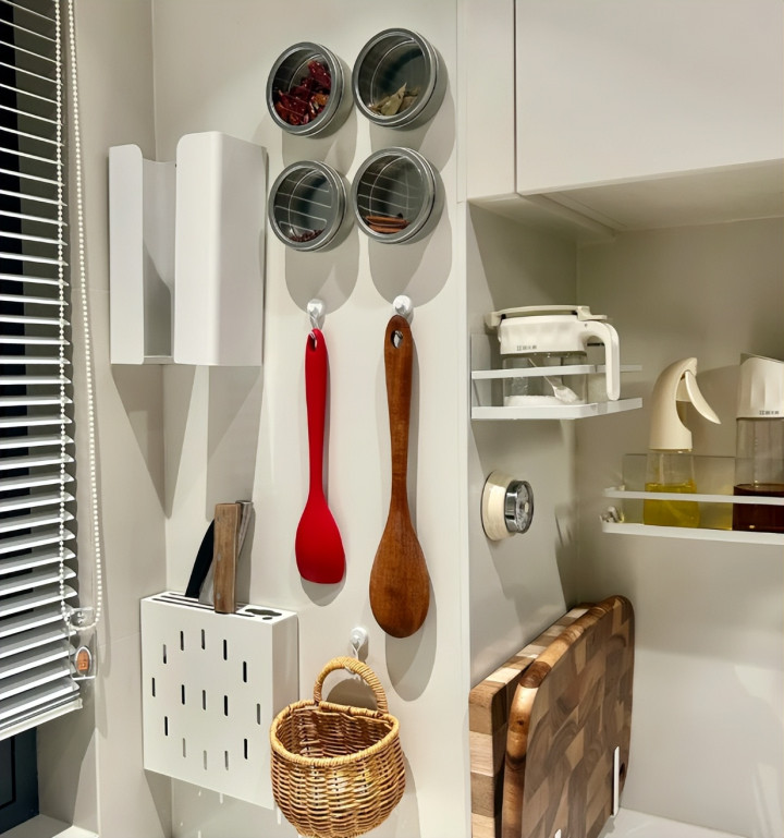 只要买一些磁吸贴,或者磁吸支架,厨房的调味料也好,其他物品也好,都可以上墙收纳,比放在灶台上方便多了。