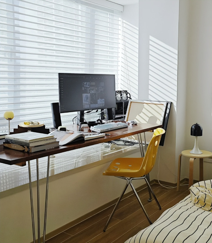 我是平时经常在家里办公,但是家里又没有书房,所以干脆在飘窗这位置做了个书桌,这样原本鸡肋的飘窗,就变成了办公区。